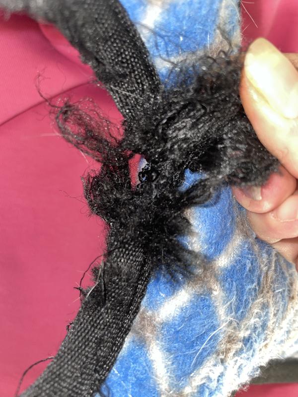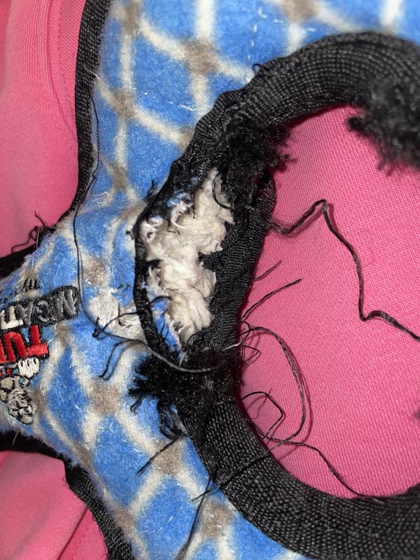 It is a tug toy, not a chew toy. It holds up very well to supervised play and it's intended use; which does not include being gnawed on. This is his fifth, and his favorite kind of toy to have for many tug sessions.. and eventually to sneak off with and destroy