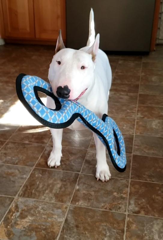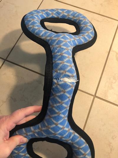 We bought this as a tug of war toy for our 80 lb Goldendoodle. He does not like it because it looks like it is not comfortable for him to grab at one end and tug with. The toy itself seems sturdy, but it kind of a waste for us since our dog does not like it.