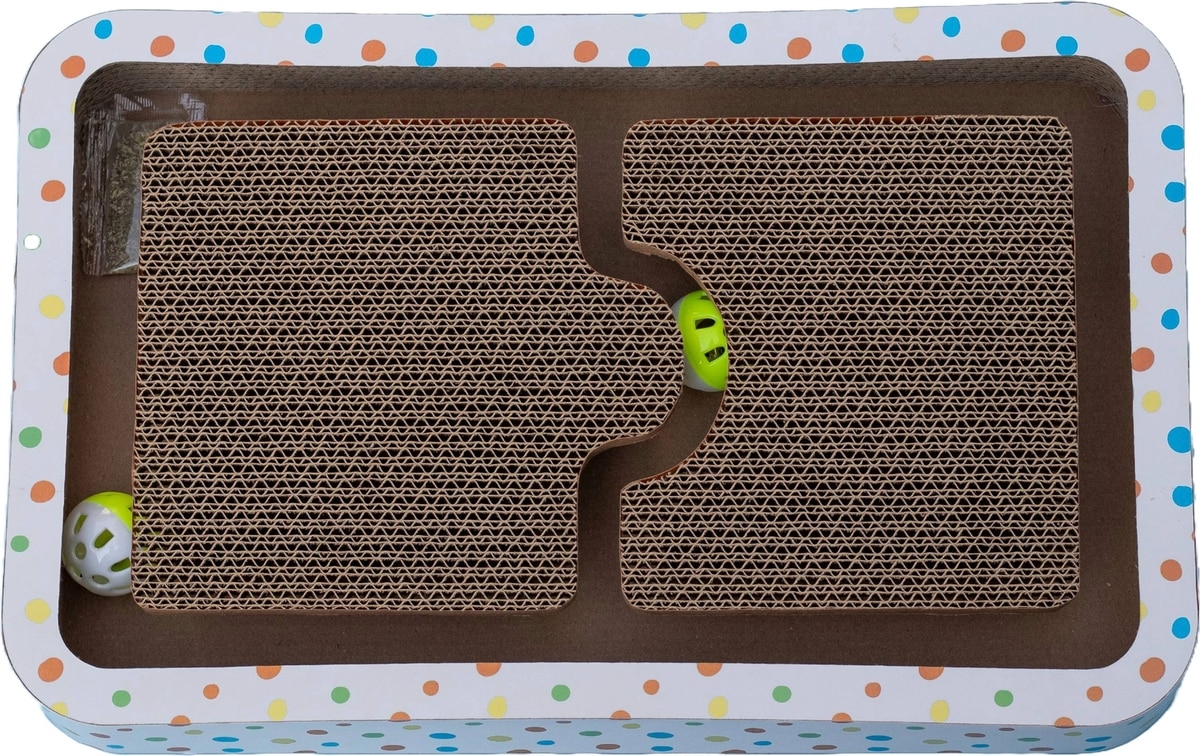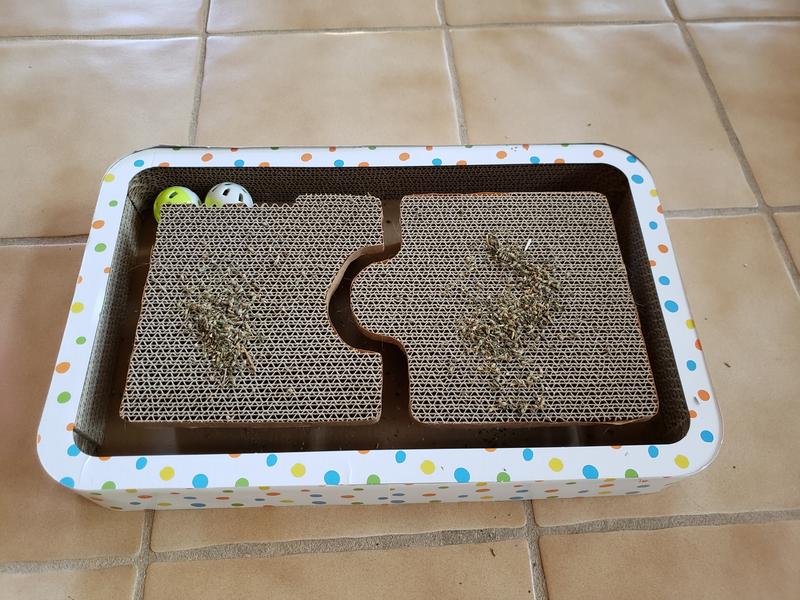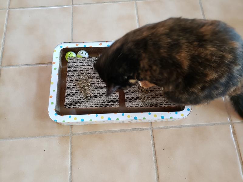 I like the cheerful look of the dots. I sprinkled the included catnip all over, which attracted the cats initially. They tried it out for scratching, but it is very lightweight and shifted around too much to be very useful. Might work better if it is secured to the floor. My cats have been choosing to use the sisal rope scratchers rather than the cardboard, but to be fair they are used to the sisal.