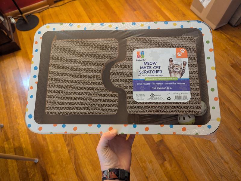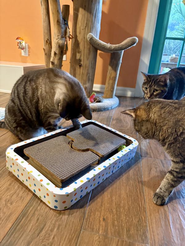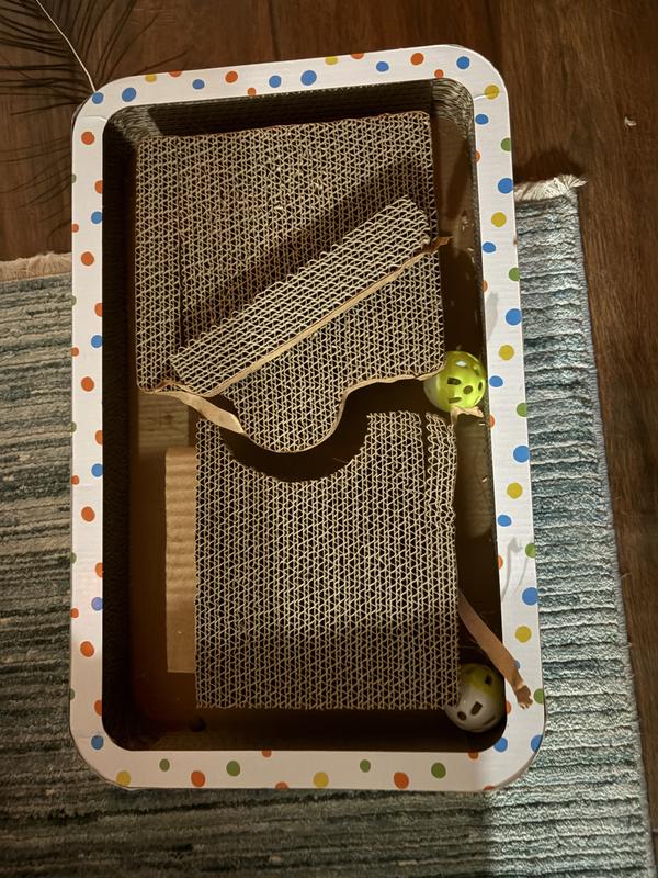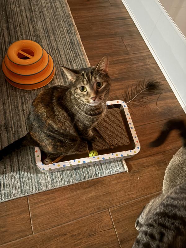 I have 4 cats and they all took to this toy immediately! It came in very fast, as always with Chewy! It comes with a little bag of catnip which was an icing on the cake. My cats started playing on it, scratching and chasing a ball. Usually you only get the scratcher but with this toy, they get to chase 2 balls around the cardboard. So far, it’s been about a week and it’s still going very strong. I’m sure it’ll last for a while and I will be getting a new one once the time comes. Highly recommend!