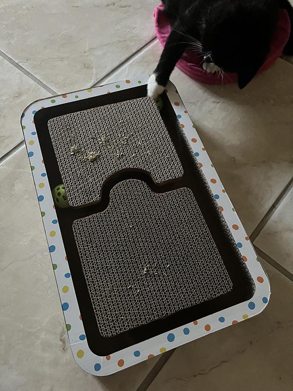 I like the cheerful look of the dots. I sprinkled the included catnip all over, which attracted the cats initially. They tried it out for scratching, but it is very