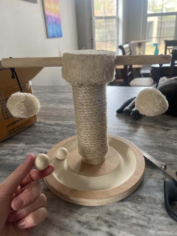 it doesnt have that second wood circle so the ball toys literally just..roll right out? could be that they forgot to give me a piece of it. the top part is fine- its a little smaller than photo makes it seem but not by much. my cats are interested in it though