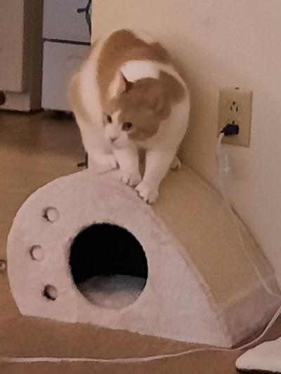 This is a great compact condo for my cat! She had surgery and had to stay confined in her high rise cage, but this fit perfectly in the bottom of it. The quality is great....made of wood and covered with carpet on the inside and out, with scratching material on the other side. And an added highlight is that it is delivered in one piece! Just take it out of the box and it's ready for your cat. She is happy and so am I.