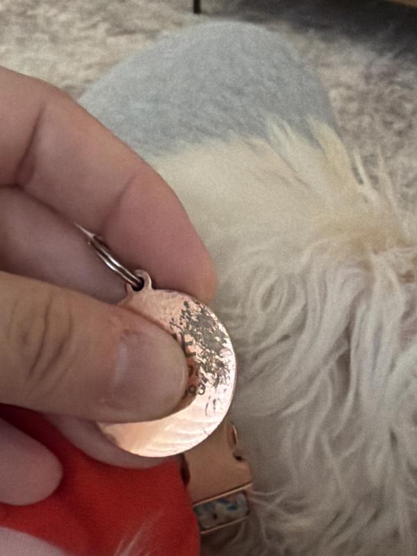 This tag is super cute, but the edges are giving way. Watching closely so my pup doesn’t bite at it and eat the metal. Wish it was more durable!