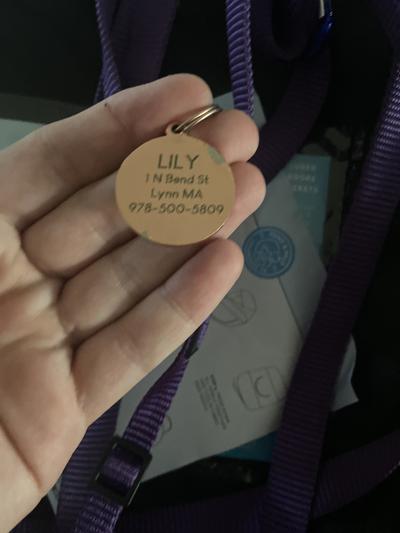 I love the front of the tag, I think its super cute. However, upon arrival the back side was scratched up already. The name/phone number was not centered, it was off to the right side (minor but noticeable). I am guessing it won't last long.