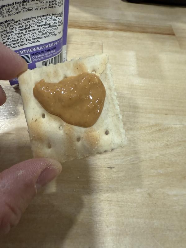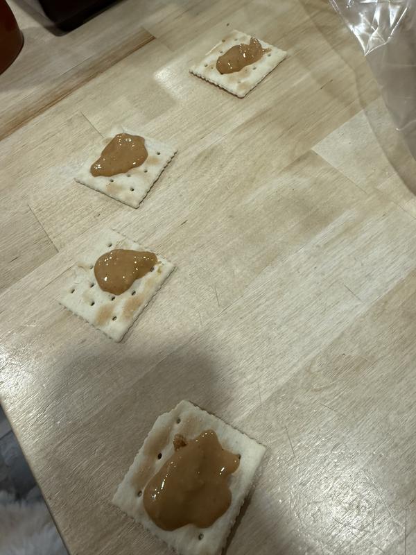 These dog peanut butter pouches are a little different to open . They’re not hard. You just have to pay attention to the directions on the packaging. I do think that a screw off lid of some sort or a tab may have been a better route here with packaging. After you tear off the cardboard, the peanut butter does come to the surface. They’re definitely are natural oils that you see like with any other peanut butter. I don’t smell anything strange with this peanut butter. My dogs did enjoy this peanut butter on crackers. I can’t really say that it made them more calm and relaxed. I also noticed that the instructions encourage you to give a lot more to your individual dog, and I gave to mine. I just feel like it was a lot. Overall, though she did eat the small amount that I had given her.
