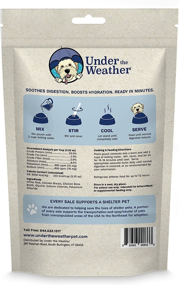 I always have a bag of "Under the Weather" on standby in case of tummy troubles. It is easy to use and our fur baby likes the taste. I usually add some extra chicken