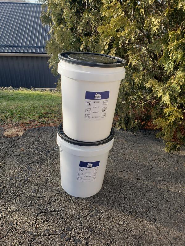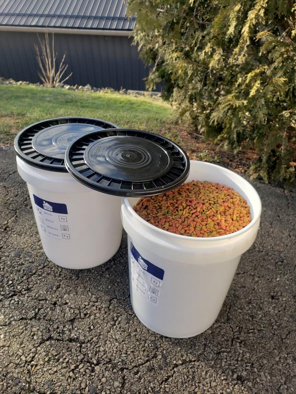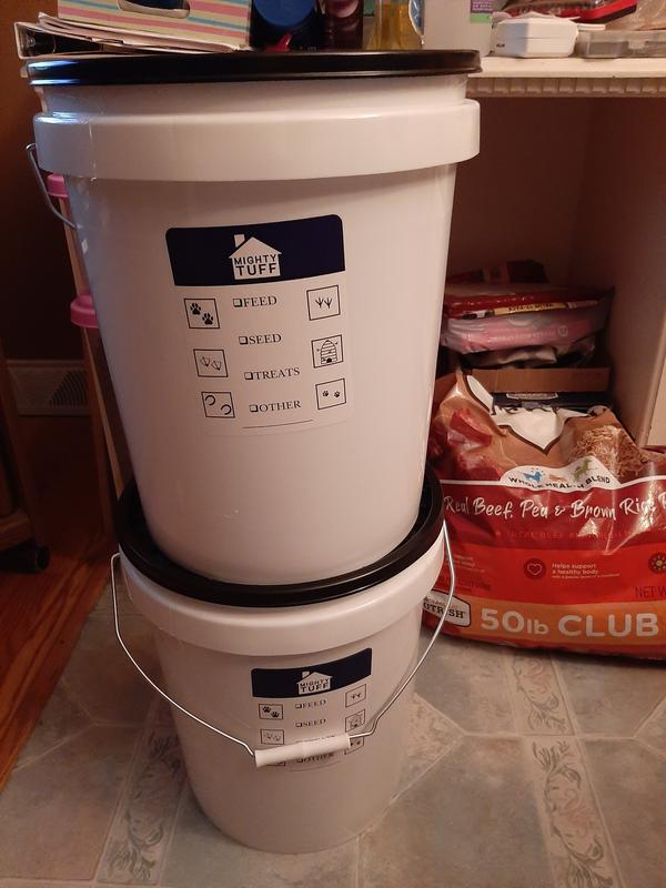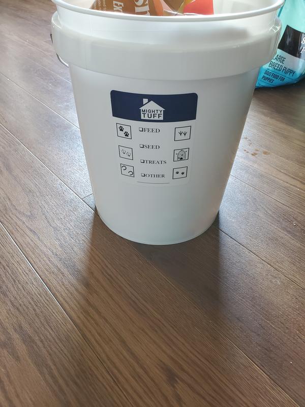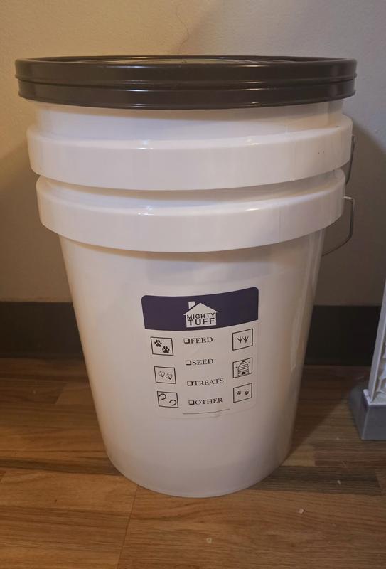 These food pails are good quality. I like that they are made in USA & BPA free. No weird plastic smell at all. I also like the label to mark what's inside. Sturdy & definitely airtight. Would be good to store food in garage or barndef. The downside I experienced is that it is extremely difficult to get the lid fully on & off. I had to use all my body weight to get the lid fully down on all sides. I ended up having to lay it on it's side, straddle it & push with both hands going all the way around the bucket to get it open. Good thing I tried it empty! In conclusion, good quality product but not good if you are arthritic or just have no upper body strength (like me).