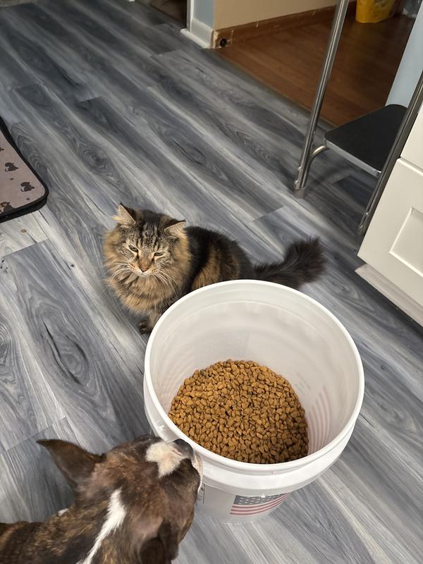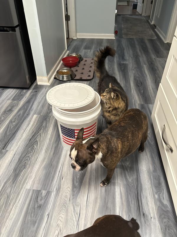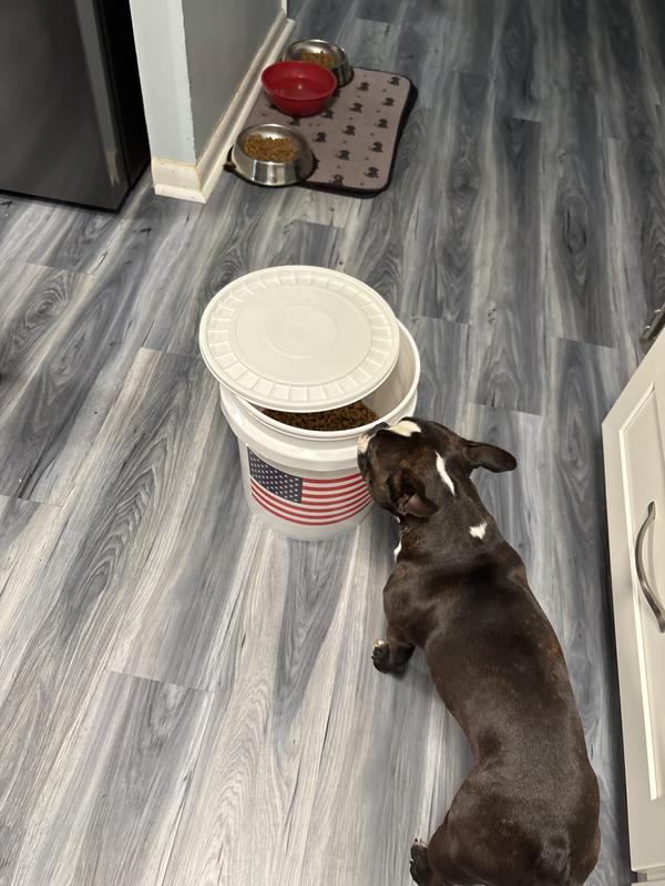 This dog food bucket is both functional and visually appealing with its cute American flag design. It holds a decent amount of dog food, making storage easy and