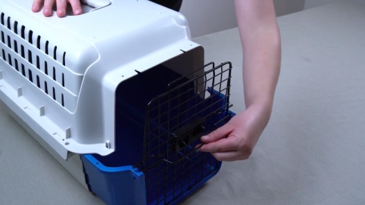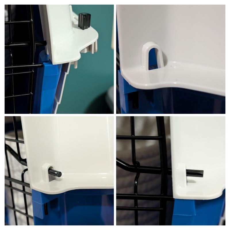 I had difficulty getting the door on this carrier. I couldn’t get the metal bars to stay in the holes at the bottom of the door. Here is a tip. Turn the carrier upside down. Line up the two bars at the bottom with the two holes. Push down on the bottom of the the carrier. The metal bars should come through the holes to secure it in place. This carrier is not made of sturdy, heavy duty plastic. It is lightweight, but I am not sure how long it will last.
