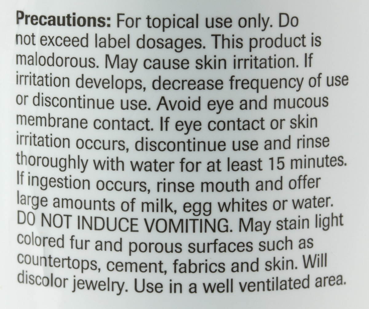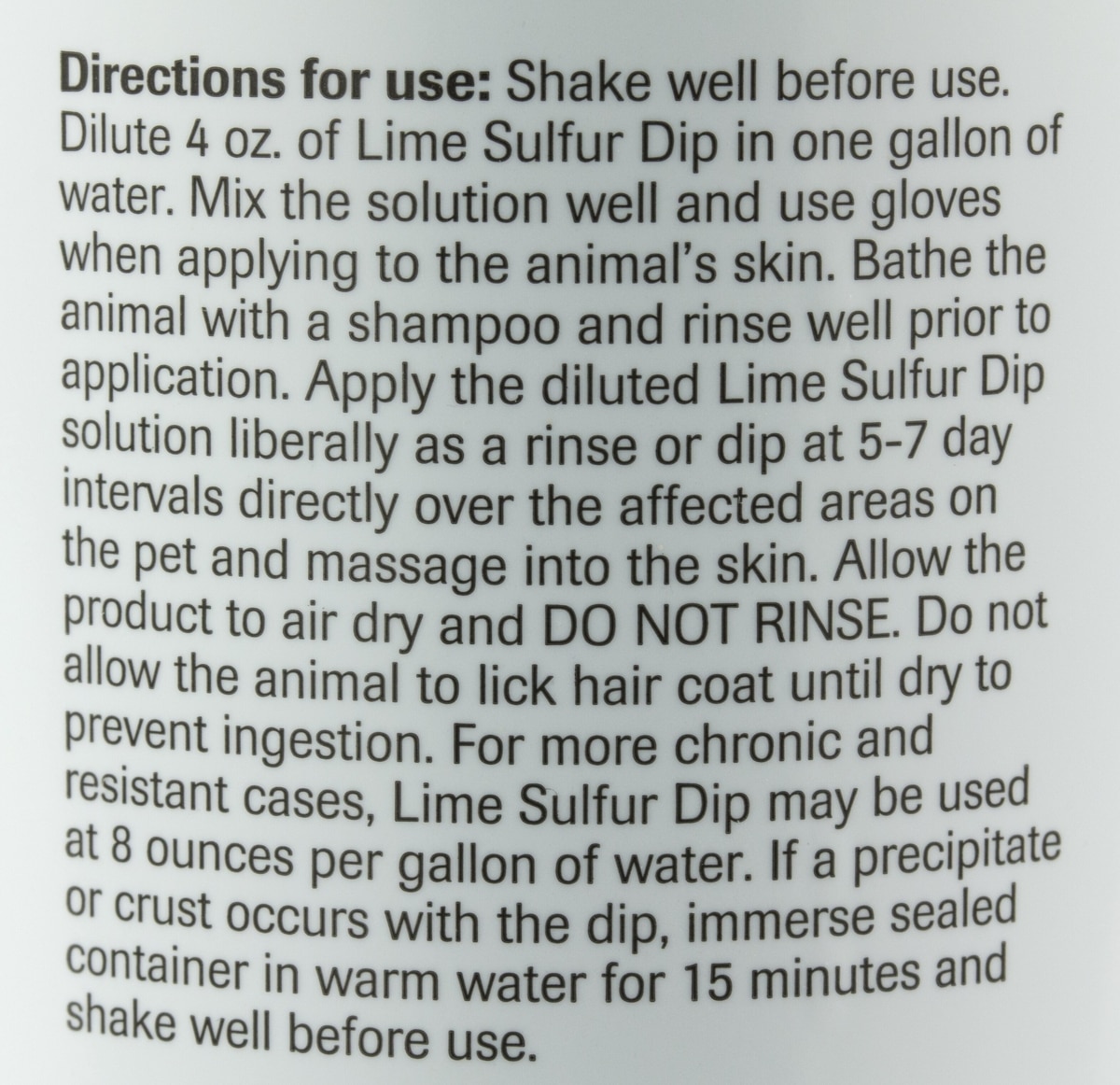 It is recommended to pour the dip solution (dilute 4 oounces of Lime Sulfur Dip in one gallon of water) over animal making sure it gets all the affected areas. Use a sponge on the animal's face to keep it out of their eyes, nose and mouth. Do not rinse or towel dry; let the animal air dry.