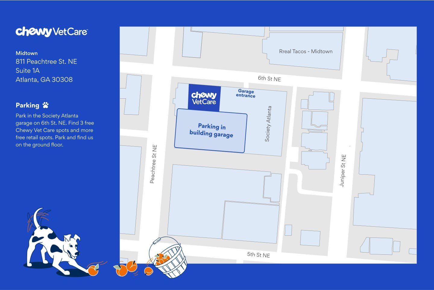 Park in the Society Atlanta garage on 6th St. NE. Find 3 free Chewy Vet Care spots and more free retail spots.