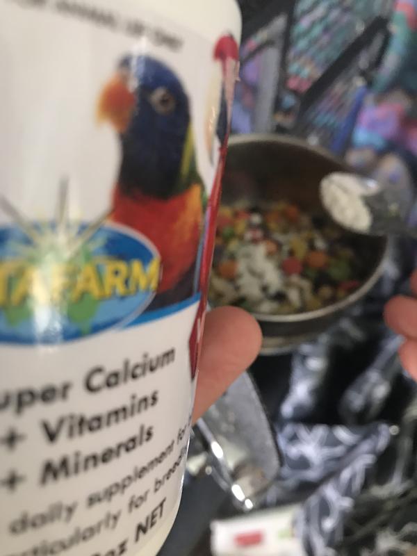 This Calcium plus vitamins and minerals comes in powder form as a daily supplement, sprinkled on top our Parrot, Max’s food. We have used it once a week for several