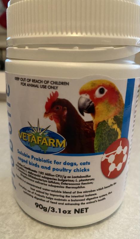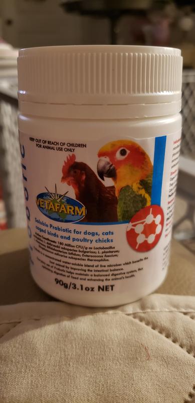 I really like this probiotic. Dissolves nicely in warm water. I use this daily for my parrots and dogs gut health. I recommend this for any tummy issues. Feathers are beautiful on my flock!