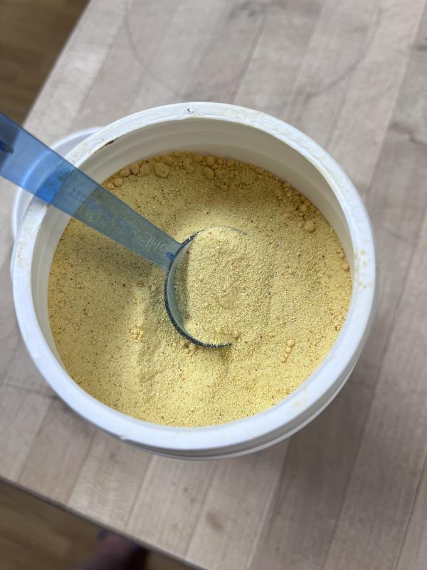 The vitamin powder doesn’t have a strong scent. My little parakeet budgie seems to like it. I’ve been putting it on the food per instructions, but I’ve usually found powdered formulas to work better mixed in the water. I don’t see any yellow on my bird’s face as some powders tend to do. I love all the vitamins and minerals in it. I think it is helping my bird through her molts as well. My container didn’t come with a scoop, although the instructions claim it should have. It’s possible it’s lost at the bottom of the container.