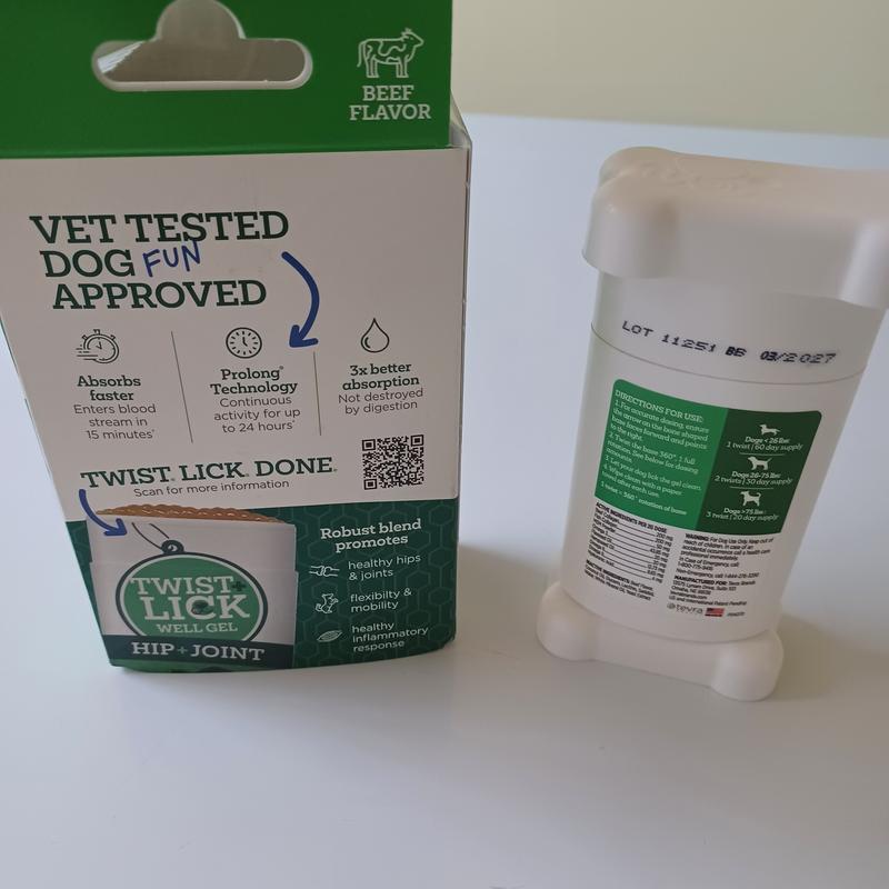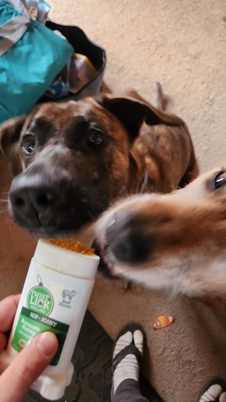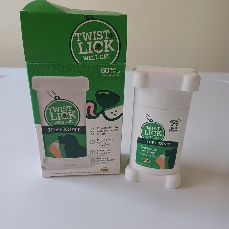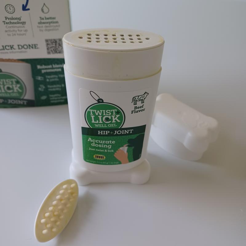 I started using Twist and Lick Hip and Joint supplement on my older rat terrier around October 8. It has been almost a month of continued use. I have seen slight changes in her comfort and her ability to move around. She seems to jump on the couch with a little more ease and interacts more playfully with the other dogs in the house. Licks it right up without a fuss and no adverse digestive issues. Easy to administer.