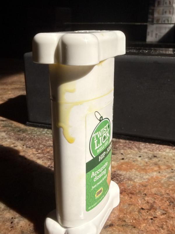 This product is great in concept, but execution needs better quality control. The product is a gel-based oil inside a plastic unit not unlike a deodorant stick that you twist on the bottom, releasing the product that your dog licks off. The issue is that the container leaks. Fortunately, the plastic stick came tucked inside of a box, so it wasn’t a complete mess, but the box had oil stains, and there was yellow oily residue on the dispenser unit. As far as the product itself being effective, I have one active middle aged Toller who is prone to wrist sprains, and a senior Golden with an arthritic hip. Both seem to like the taste of the supplement and could use whatever help they can get to ease their joint pain. Once I got the container cleaned up, it was fine to operate and give proper dosing.