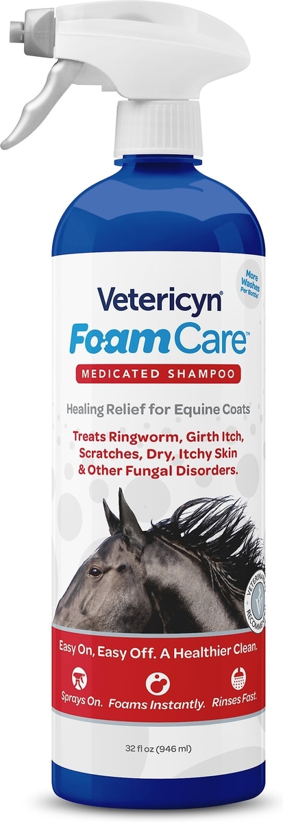 Spray. Foam. Rinse. Vetericyn FoamCare sprays on, foams instantly, and rinses off quickly and easily. The sprayer helps you get to those hard-to-reach spots and delivers nutrients to the skin, providing your horse’s coat with a long-lasting shine.