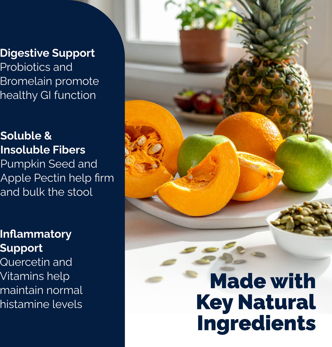 • Includes digestive enzymes and omega fatty acids to nourish gut health, ease seasonal discomfort, and support everyday comfort for your pup.