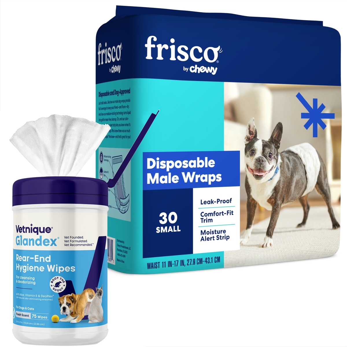 Bundle: Vetnique Labs Glandex Wipes Hygienic Rear End Wipes, 75 count + Frisco Disposable Male Dog Wraps, Small, 30 count
