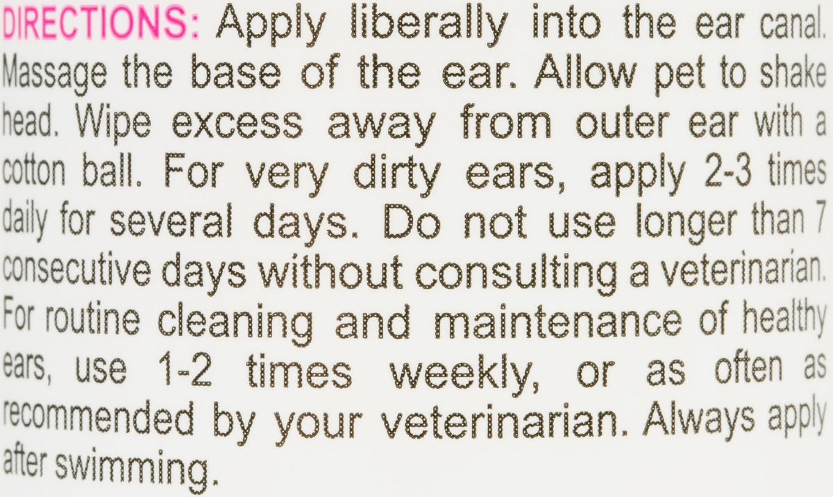 Apply Ear Cleansing Solution liberally into the ear canal of the cat or dog. Massage the base of the ear. Allow pet to shake head. Wipe excess away with a cotton ball.
