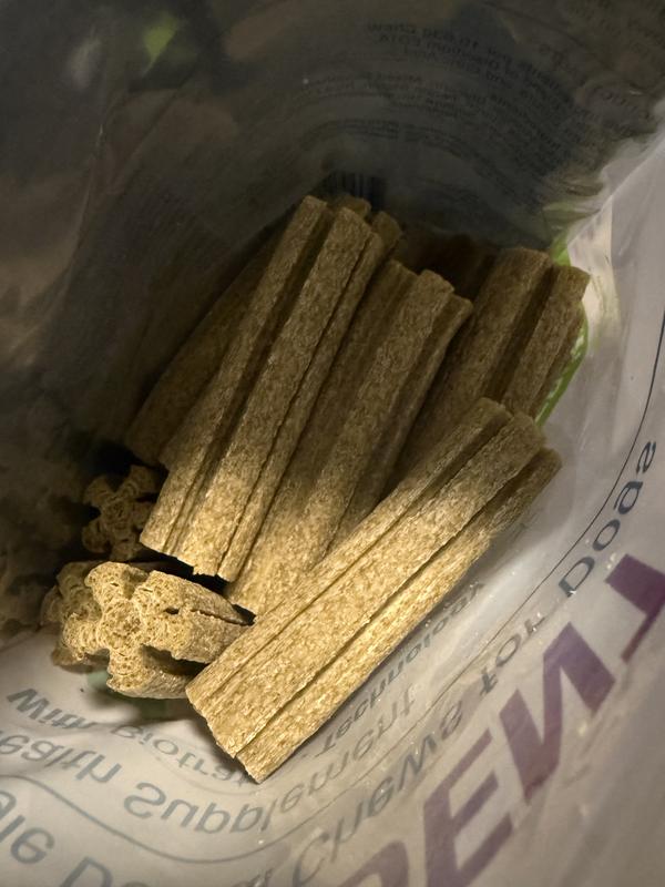I’m really impressed with these chews! My dogs enjoys them as well. They have a pleasant, mild smell (not that overpowering “dog treat” odor), and they don’t leave any sticky residue behind. The chews are firm enough to give her a good workout but not so hard that I worry about cracking a tooth. They’re also vegetarian and easy on her stomach, which is a big plus. Overall, I’m really happy with this product—it’s effective, healthy, and clearly delicious to my dog. I’ll definitely be buying again!