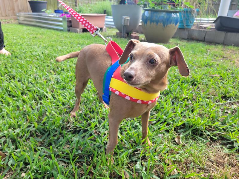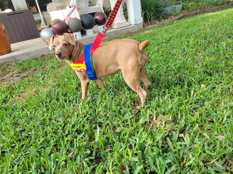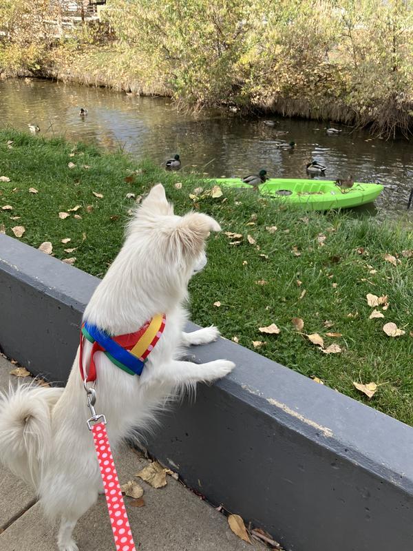 First of all, this thing is really cute. I love the bright colors on him. It fits his personality. It was really easy to get on him and he is a wiggler. Overall, I really like this harness and it seems very comfortable. As with any harness I do see the possibility of him backing out of it. This is something that he’s particularly good at. He didn’t manage to get Loose, And I will continue to use this harness because I know even if he does get loose he won’t go very far. He never does.