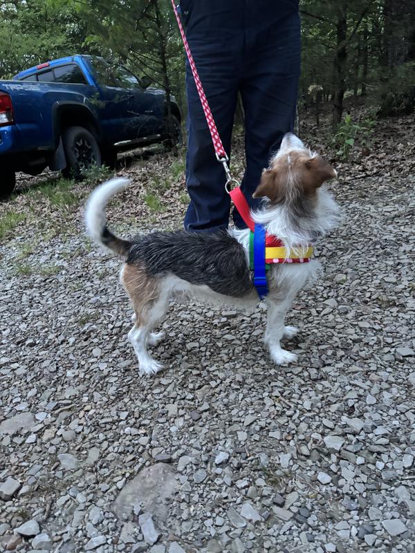 Great harness. We like that there is no metal. It’s durable and sturdy. The leash clips on a loop that is elevated so it doesn’t rub on our pups back. Overall a well-made, bright, happy harness.