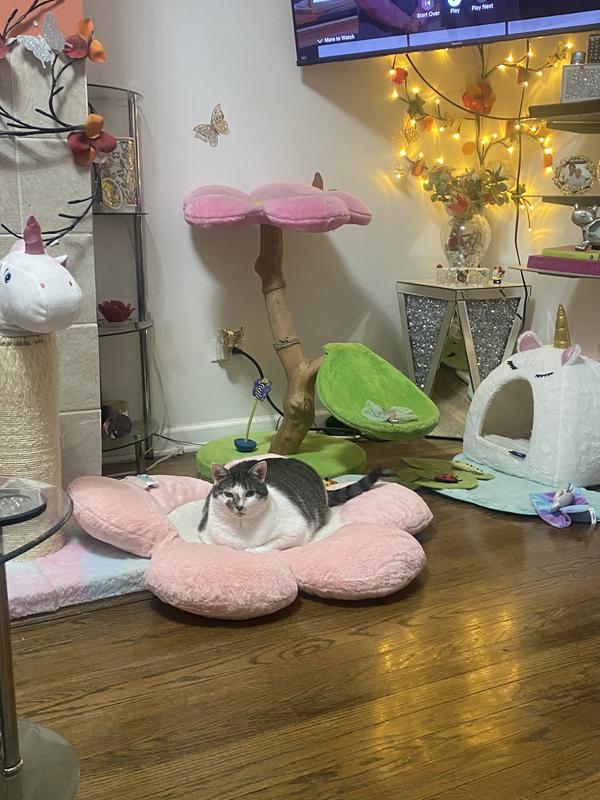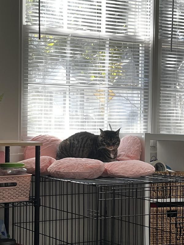 I bought this specifically for my one kitty girl as she’s much chunkier than her 3 brothers & doesn’t like to share her special spots. She loves it, but unfortunately so do her brothers. Smh As you can see I’ve really tried to give her her own special space. It’s super soft, easy to clean and stays plush. I just wish rather than the brand being so prominent on it, they should offer to monogram it with your pet’s name. That would’ve made this a 5 star review! I bought this bc it’s cute & matches my girlie decor for my perfect kitty girl but neither of us need the brand name incorporated into our space or decor.