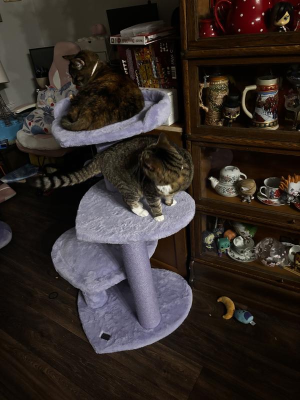 We placed this in our cat cafe as purple is kinda our thing; however the top platform just broke after only a few months of use. I'll be contacting the manufacturer to see if we can get a replacement or a refund. I tried attaching a photo but it kept saying it was too large.