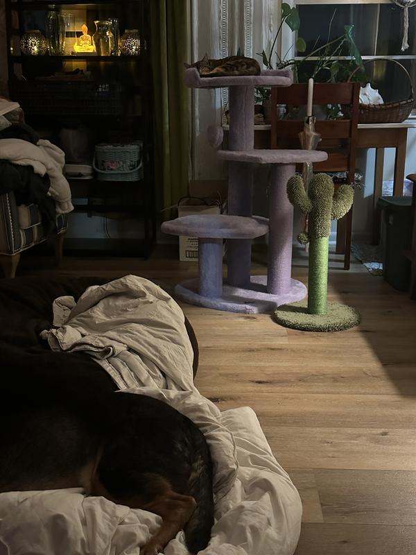 We placed this in our cat cafe as purple is kinda our thing; however the top platform just broke after only a few months of use. I'll be contacting the manufacturer