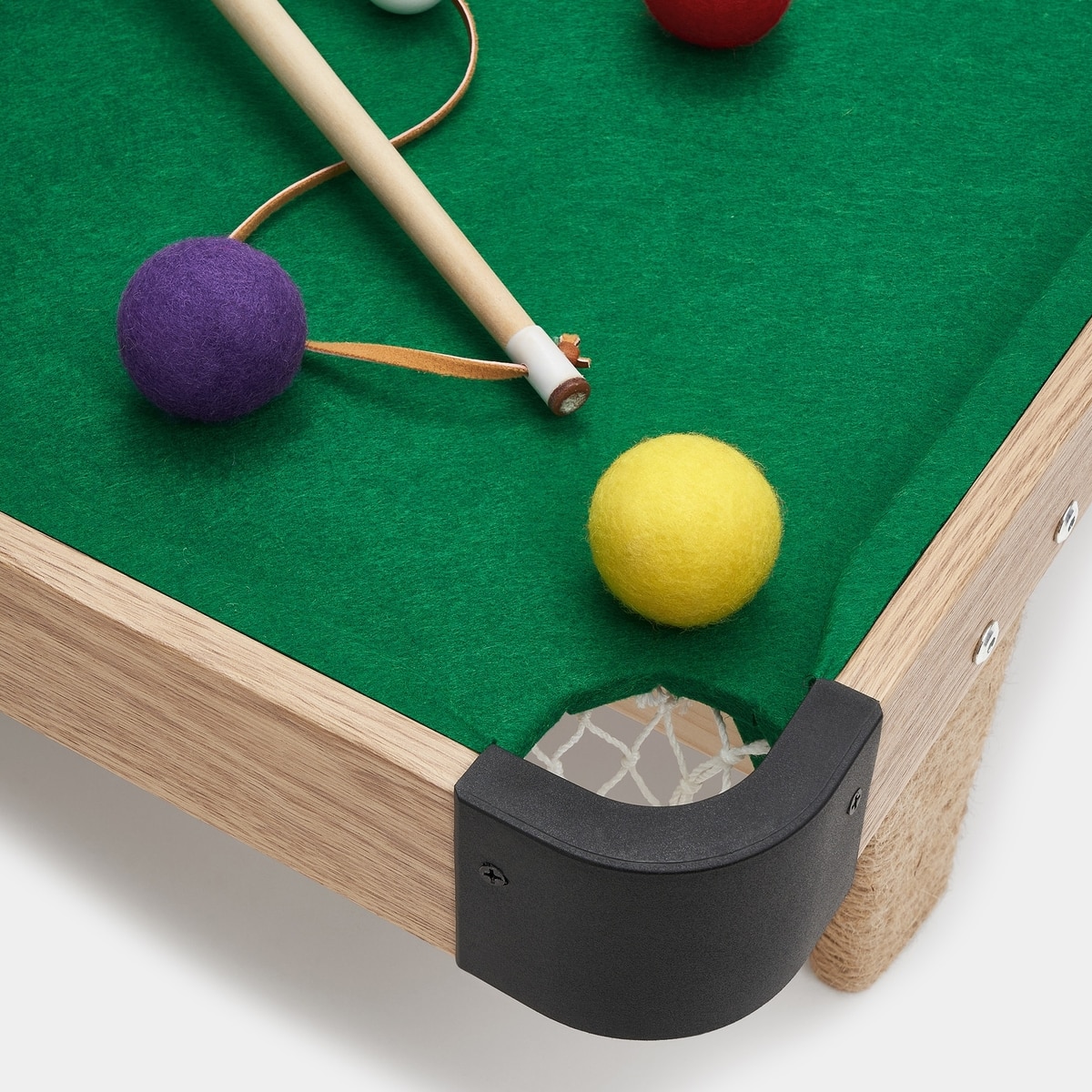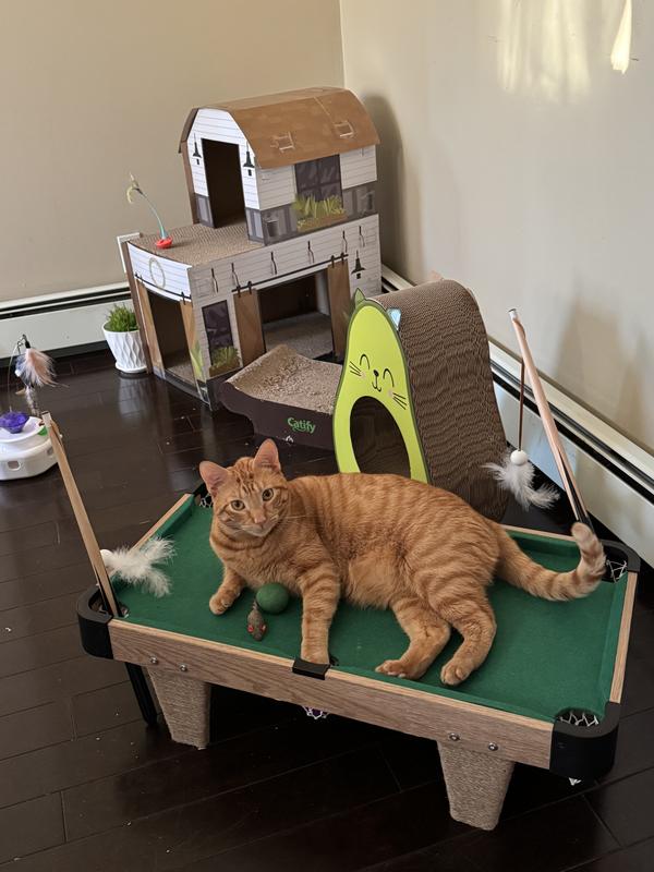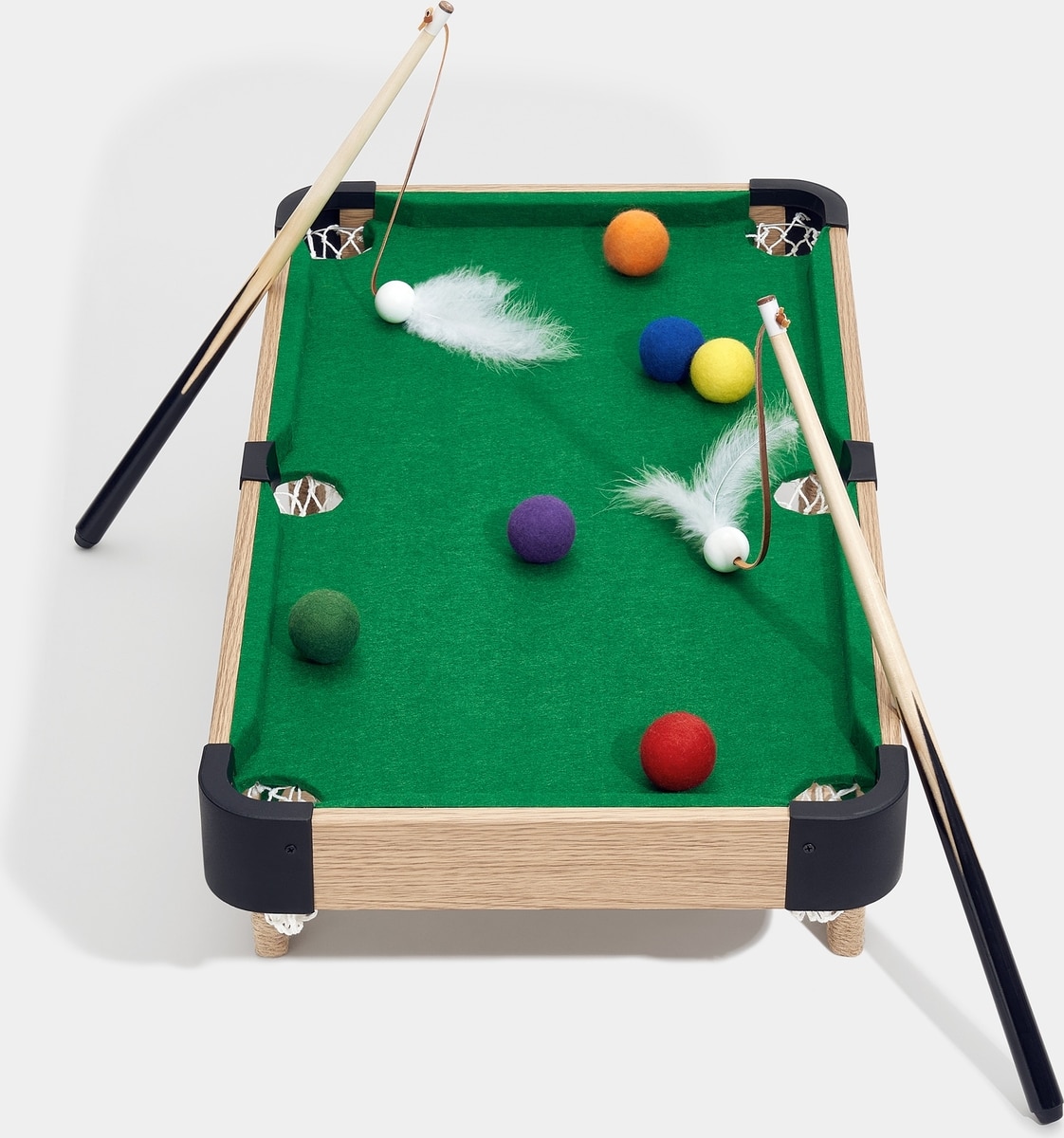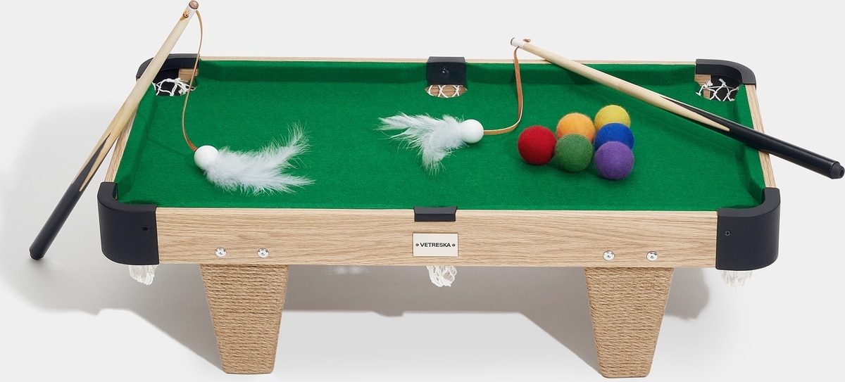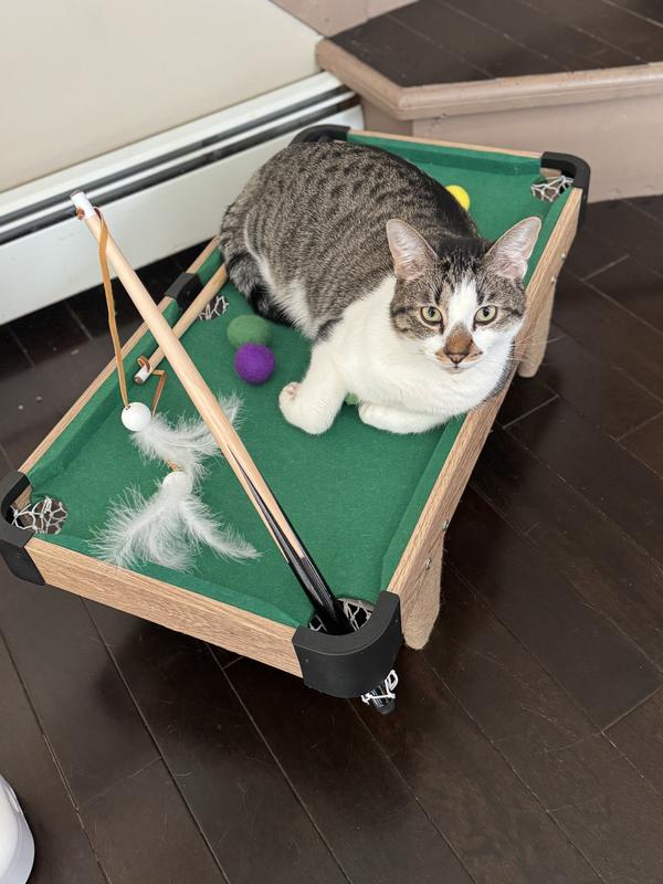 - This pool table for puddies comes with plenty of ways to play—each set includes 6 snooker balls, 2 cue stick feather wands and a felt-lined table with multiple scratching surfaces.