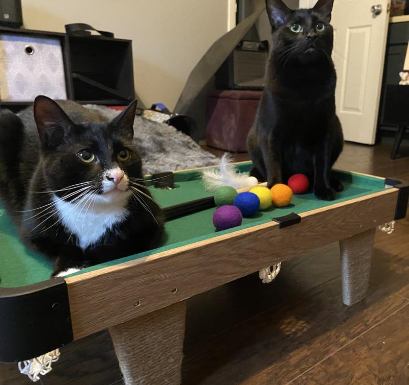 My baby loves this pool set, as you can see from the picture. No, I did not pose her, she finished up playing on the table a bit ago, and then came over and laid with the cue like that. I rolled the blue ball over, and she batted it between her front paws. As you can see, she enjoyed chewing the feathers off of the cue ball. She loves to reach into the pockets and pull the other balls out. For lounging, and for play, this item is great. We love it.