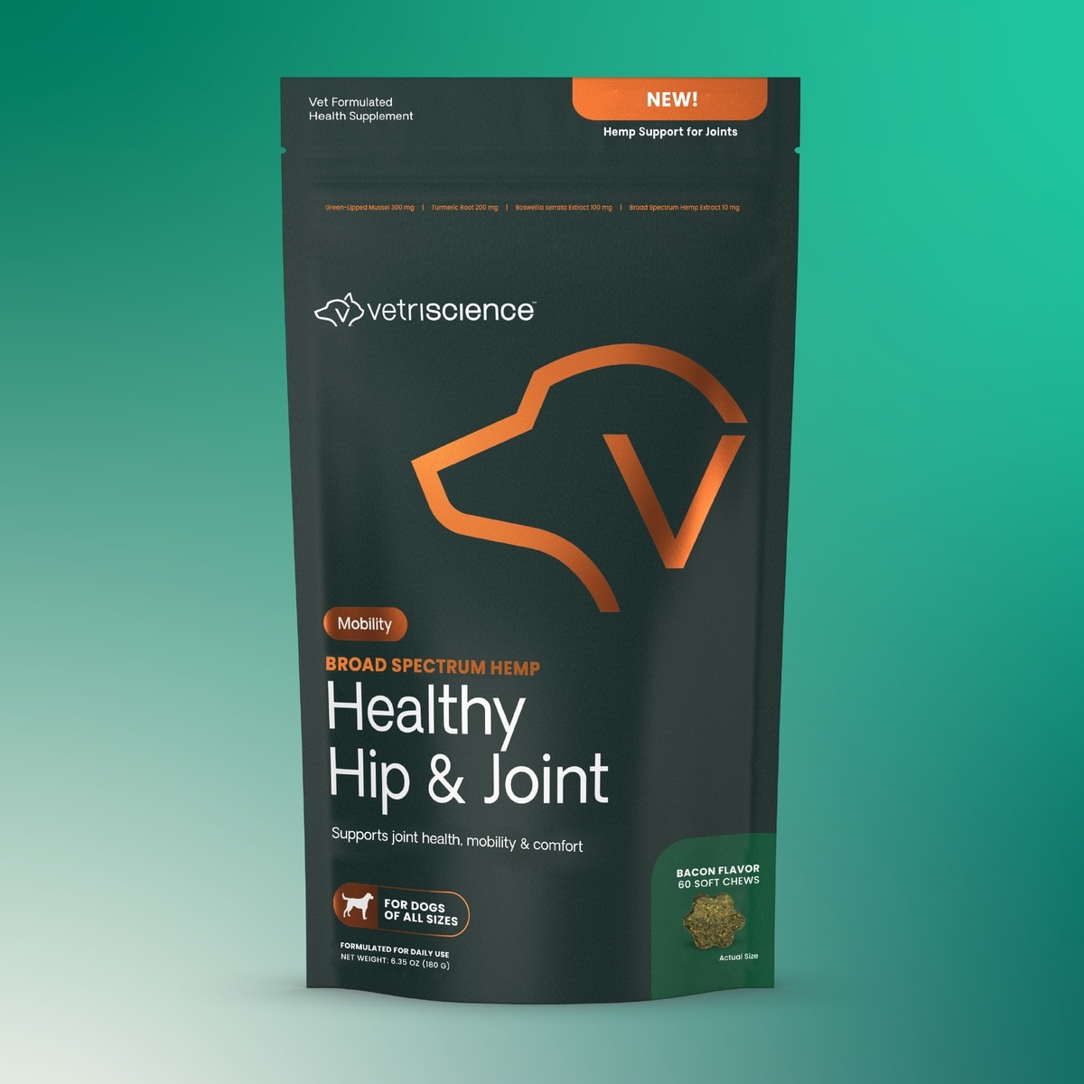 VetriScience Broad Spectrum Hemp Healthy Bacon Flavored Chews Hip & Joint Supplement for Dogs, 60 count