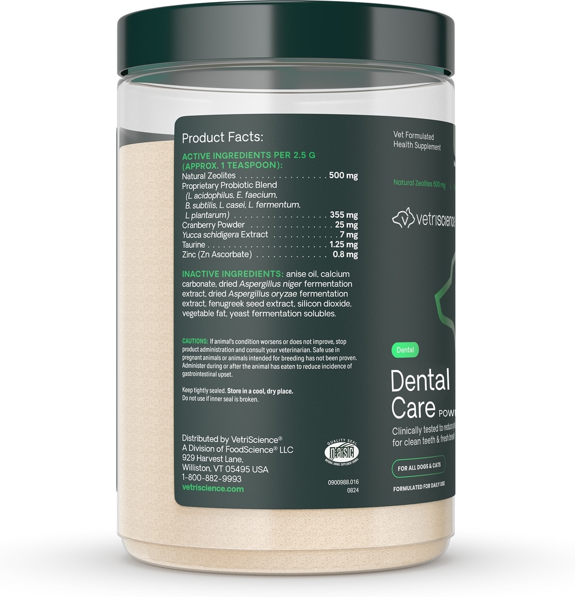 VetriScience Dental Care powder, chews, and bites are made with science-backed ingredients like zeolites and probiotics to fight plaque and zinc, cranberry, and taurine to support gum tissue health. Probiotics help freshen breath, too.