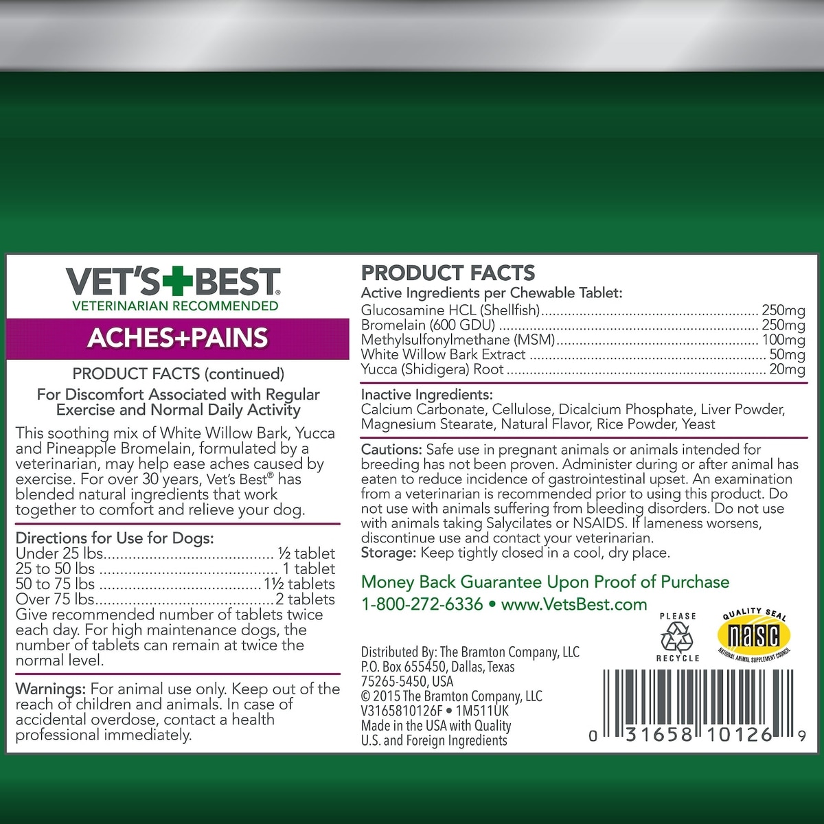 JOINTS: Hip + Joint Natural Formula and Advanced Hip + Joint are made with glucosamine and chondroitin for better joint mobility. Help address aching joints with Vet's Best Aches + Pains, the potent aspirin-free formula that contains active ingredients like glucosamine HCL, MSM, bromelain, yucca and white willow bark to support very active or senior dogs.