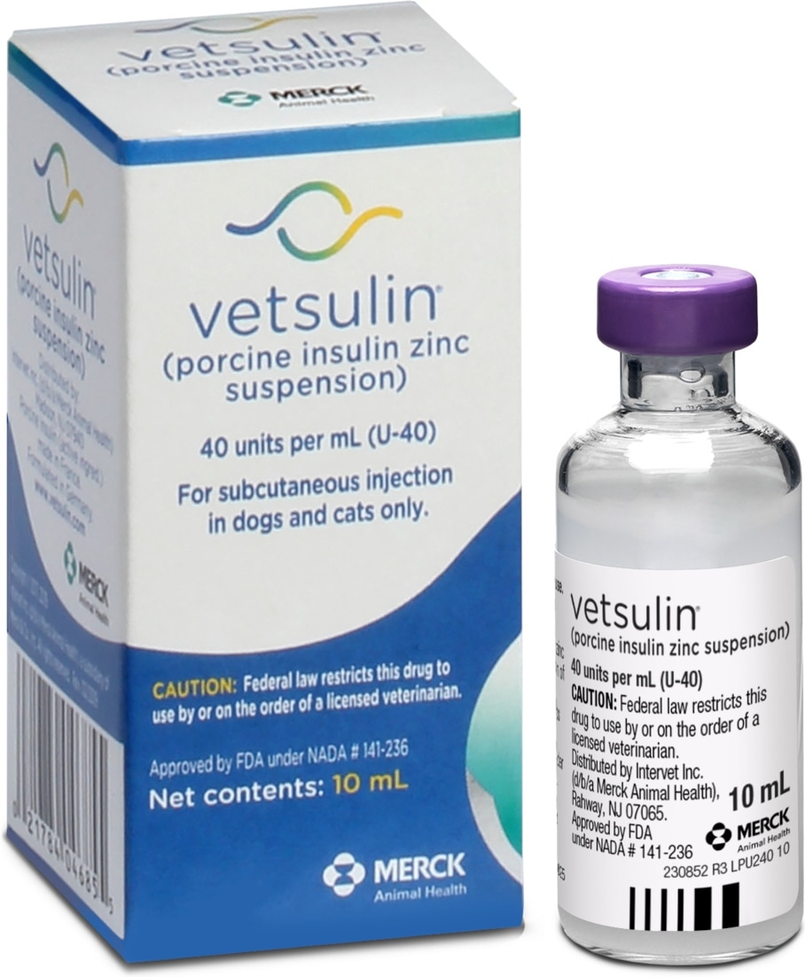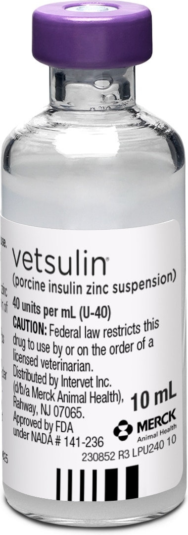 The first and only insulin approved by the US Food and Drug Administration for treating both canine and feline diabetes mellitus. Vetsulin (porcine insulin zinc suspension) is produced by Merck Animal Health and is available only by prescription.
