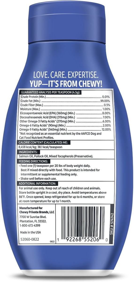 I chose this product specifically for the bottle design and because its wild Alaskan formula. I was tired of using salmon oil with pumps because it'd get messy toward the end when you're trying to dispense with more force and the oil squirts out messily. We haven't had any spills with this bottle, the 54 oz will last us a while, the price is reasonable, and the best part is that it's a Chewy brand so you know the product is good!