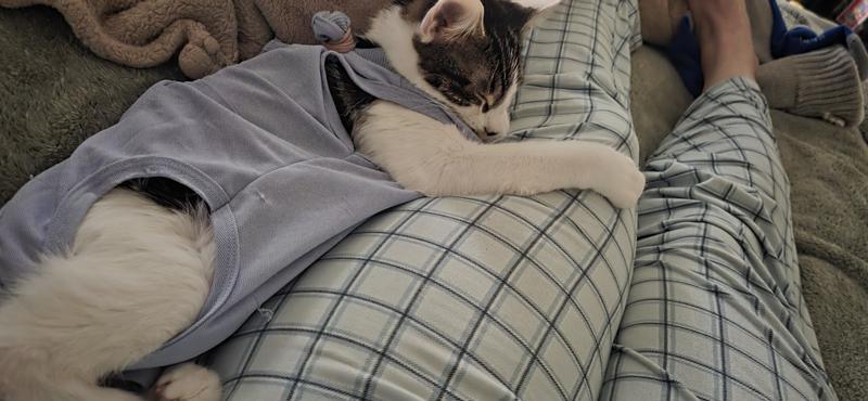 This recovery suit features a large opening for the rear end, allowing cats to use the bathroom freely. It is easy to put on and take off, if needed.