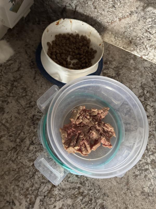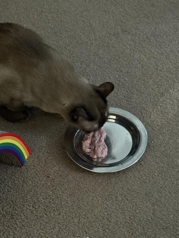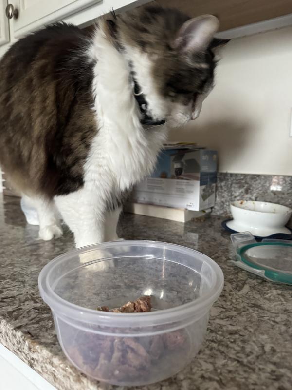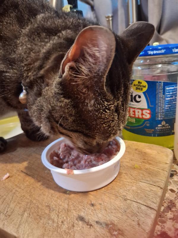It’s easy enough to thaw and feed, but none of my three cats seem to like it. I might try warming it up to see if that helps, but right now, I’ve been feeding it to my dogs as a treat. They love it.