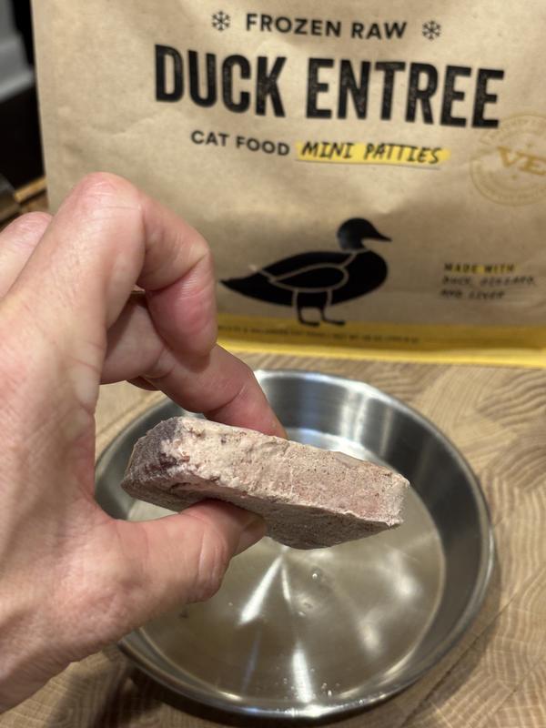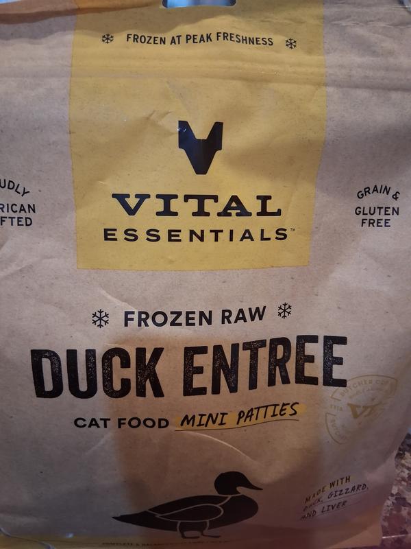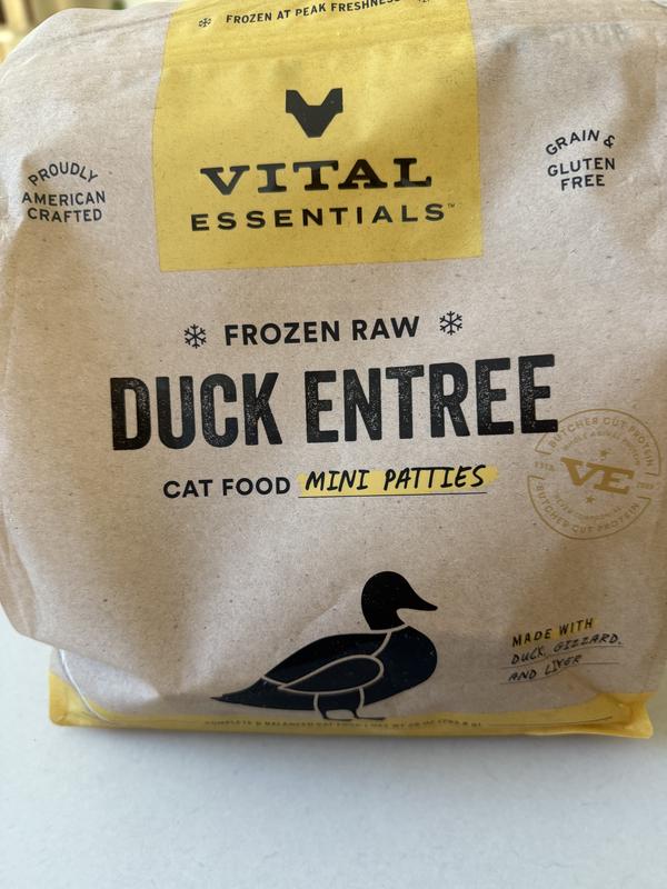 I received frozen raw duck entree mini patties for my cat to try. It was a big hit! My cat loved it. He is on a vet prescribed diet gor his skin allergies and can have venison, duck or rabbit. I ordered the duck for him to try and I will order future products from Vital Essentials.
