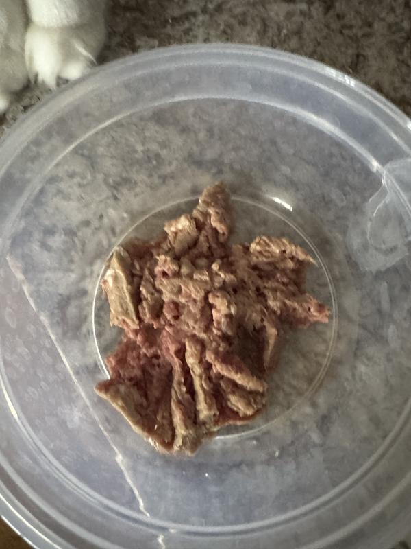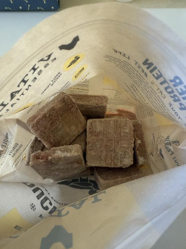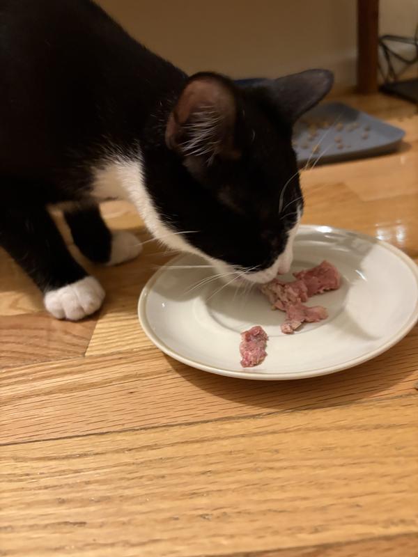 I was excited to try this new product, because of the frozen/raw aspect of the food, good ingredient list, and the fact that it was not chicken. However after providing the thawed and now room temperature food to my cats (8 cats) over a period of days, none of them were interested in it.. After a few sniffs, the cats turned away, looking for other food. Sad because they like other Vital Essentials Freeze Dried items.