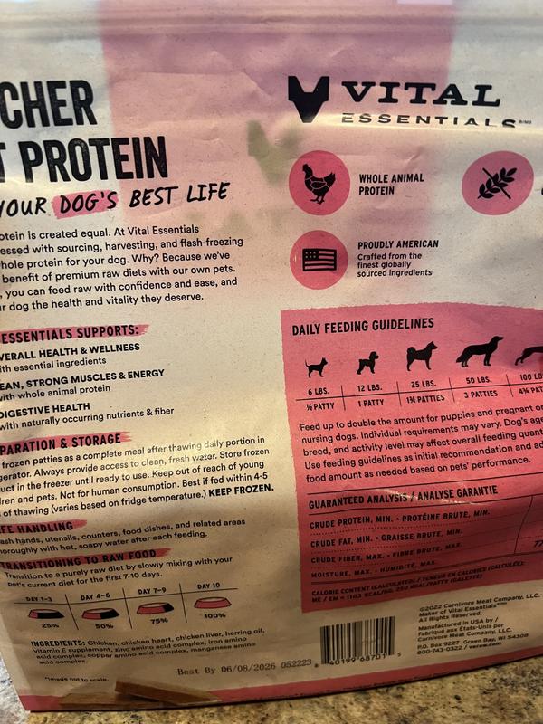 Every dog deserves the benefits of raw protein. Vital Essentials frozen patties offer whole-animal nutrition with Butcher Cut Protein in a variety of flavors. Just thaw, serve, and watch your dog thrive with complete and balanced raw nutrition.