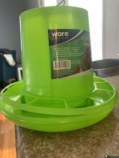 Do not buy this cheap and flimsy chicken feeder!! This is not a sturdy product. I didn’t even put feed in it because it barely stays together empty!