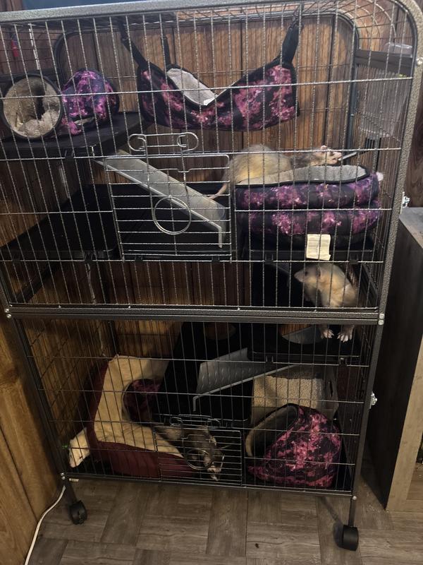 When my daughter first became a ferret owner, we bought a "beginner" cage. After getting the second ferret, the first cage was ok. But, we needed bigger. We really love this bigger cage because in addition to being larger, it has full sized doors, at two levels, along with a couple of smaller doors. So access for cleaning etc is so much easier! The multiple levels are fun and give our girls options for moving around and playing! There is even a "penthouse" level they enjoy stretching out on! There is enough room for a small cardboard box, for hiding and sleeping in, three hammocks, toys, a bowl for water, and still room for rolling around and tussling in! We are very, very pleased with this purchase. Also very easy to put together. Although the provided allen wrench broke along the way, but that wasn't a big deal. If we had the means and the space, we'd buy a second one and put them together!