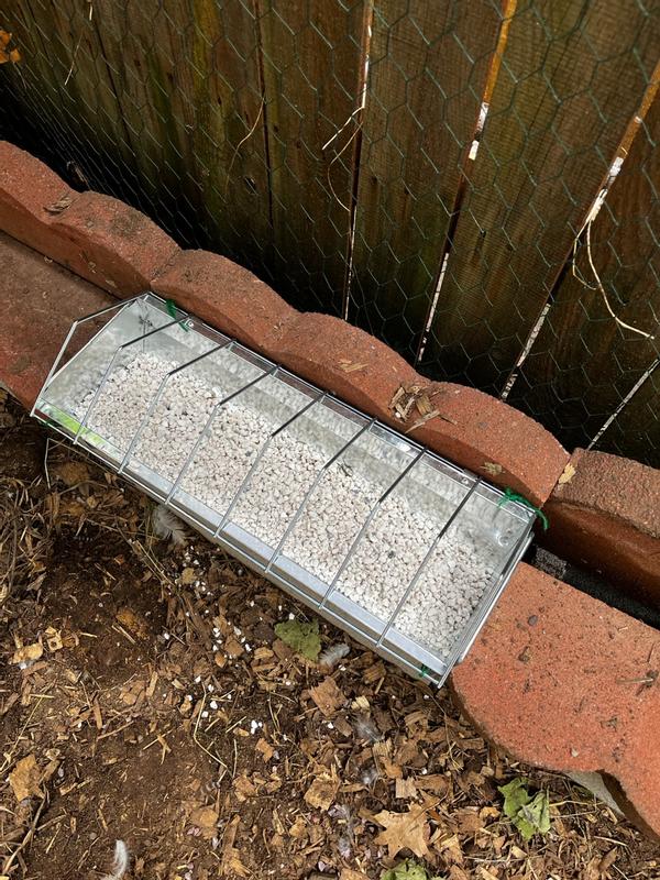 • A metal trough feeder made for backyard chickens.