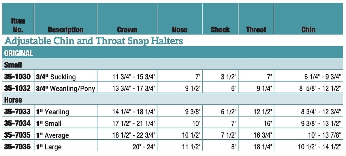 To determine which size halter is needed, it's recommended to measure the noseband, the cheek, and the throat & polestrap. For the complete sizing chart, click the “Size” tab, next to the “Instructions” tab, just under the product photos.