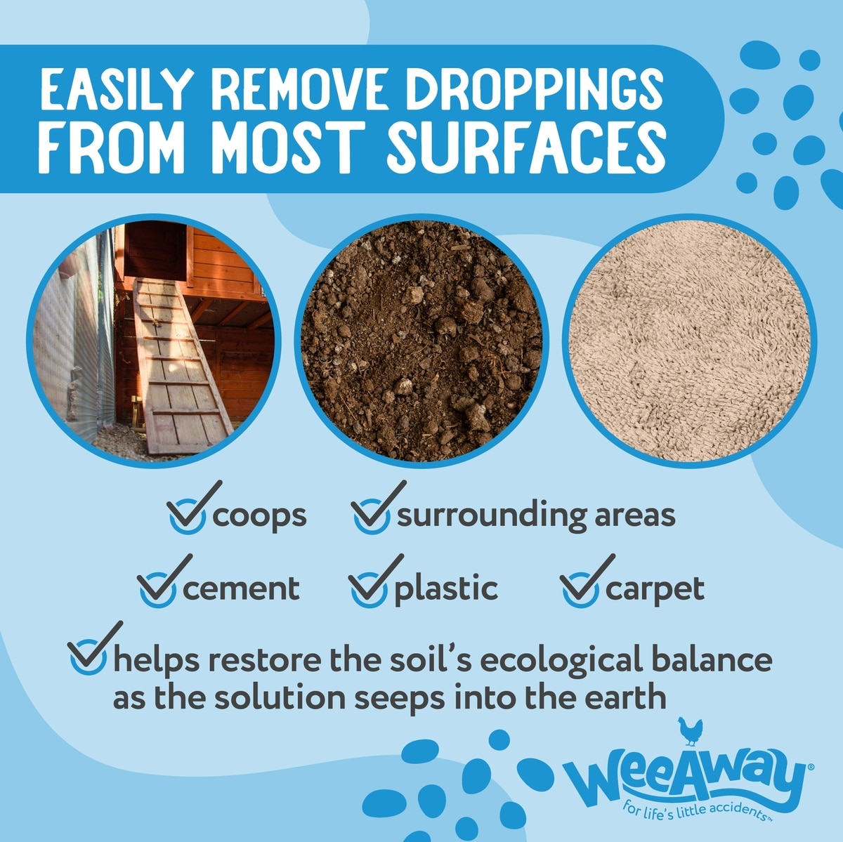 This environmentally friendly, bird safe product is formulated to easily remove droppings from most any surface including coops, surrounding areas and even carpets. For healthy birds, clean the coop every 2-4 weeks.