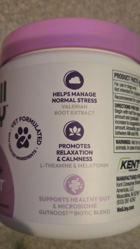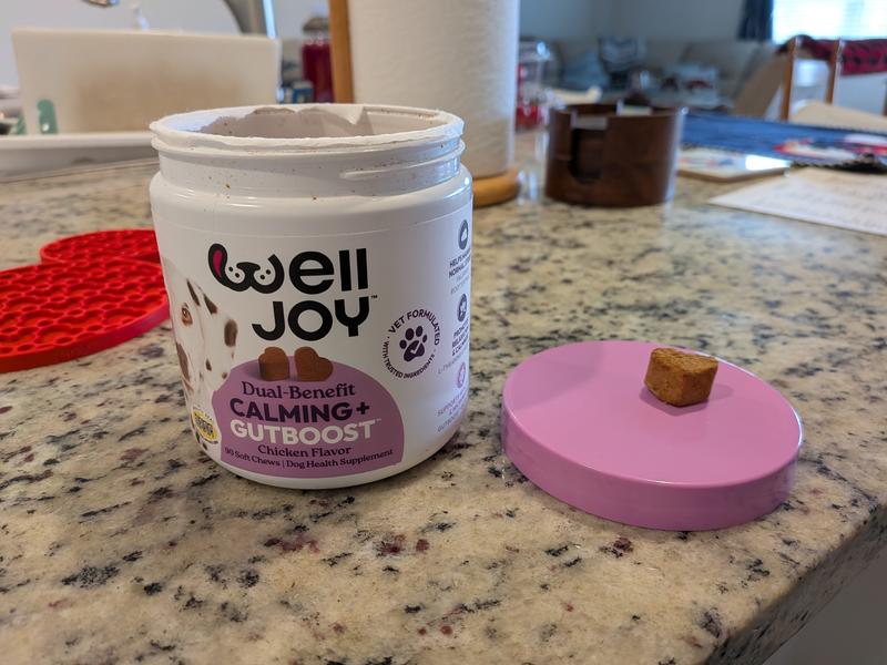 I’m giving this supplement to my Pyrenees mix and my Corgi. I don’t think it has made either one any calmer, but their poops have been consistently good, so the gut health component is working. Both dogs eat these with no fuss and unlike lots of other supplements, these smell like treats.