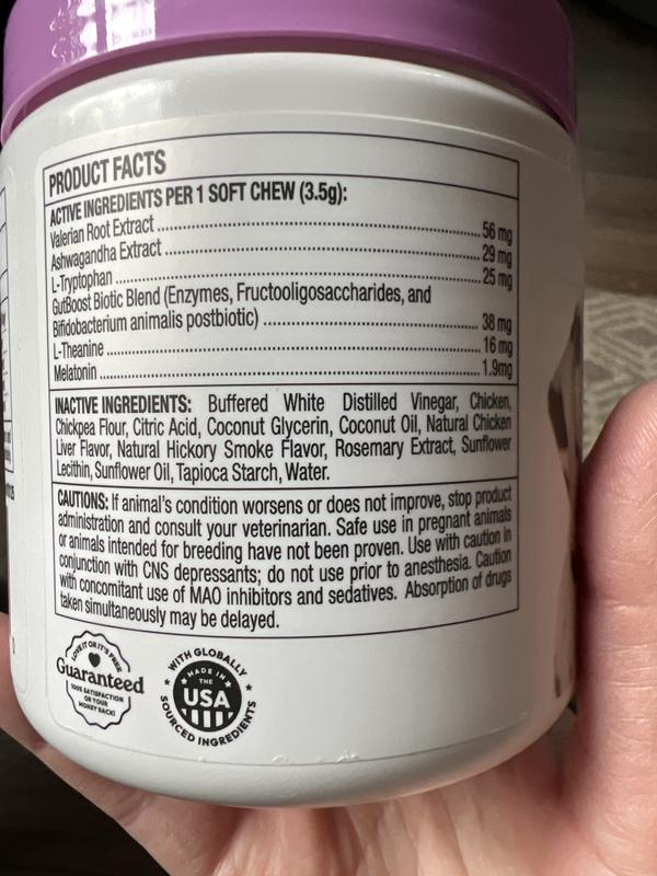 Valerian Root Extract, Ashwagandha Extract, L-Tryptophan, Gutboost Biotic Blend (Enzymes, Fructooligosaccharides, And Bifidobacterium Animalis Postbiotic), L-Theanine, Melatonin. Inactive: Buffered White Distilled Vinegar, Chicken, Chickpea Flour, Citric Acid, Coconut Glycerin, Coconut Oil, Natural Chicken Liver Flavor, Natural Hickory Smoke Flavor, Rosemary Extract, Sunflower Lecithin, Sunflower Oil, Tapioca Starch, Water.